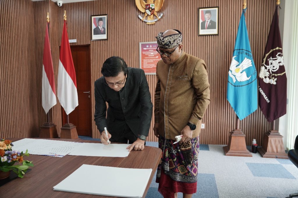 Foto : Rektor ISI Bali, Prof. Dr. Wayan ‘Kun’ Adnyana (tengen) sareng Penasihat Presiden Phetchaburi Rajabhat University-Thailand, Asst. Prof. Dr. Sanor Klinngam ring acara penandatanganan Deklarasi B-GAAD, Anggara (28/10) ring Ruang Sabha Citta Mahottama, Gedung Desain Hub ISI Bali.