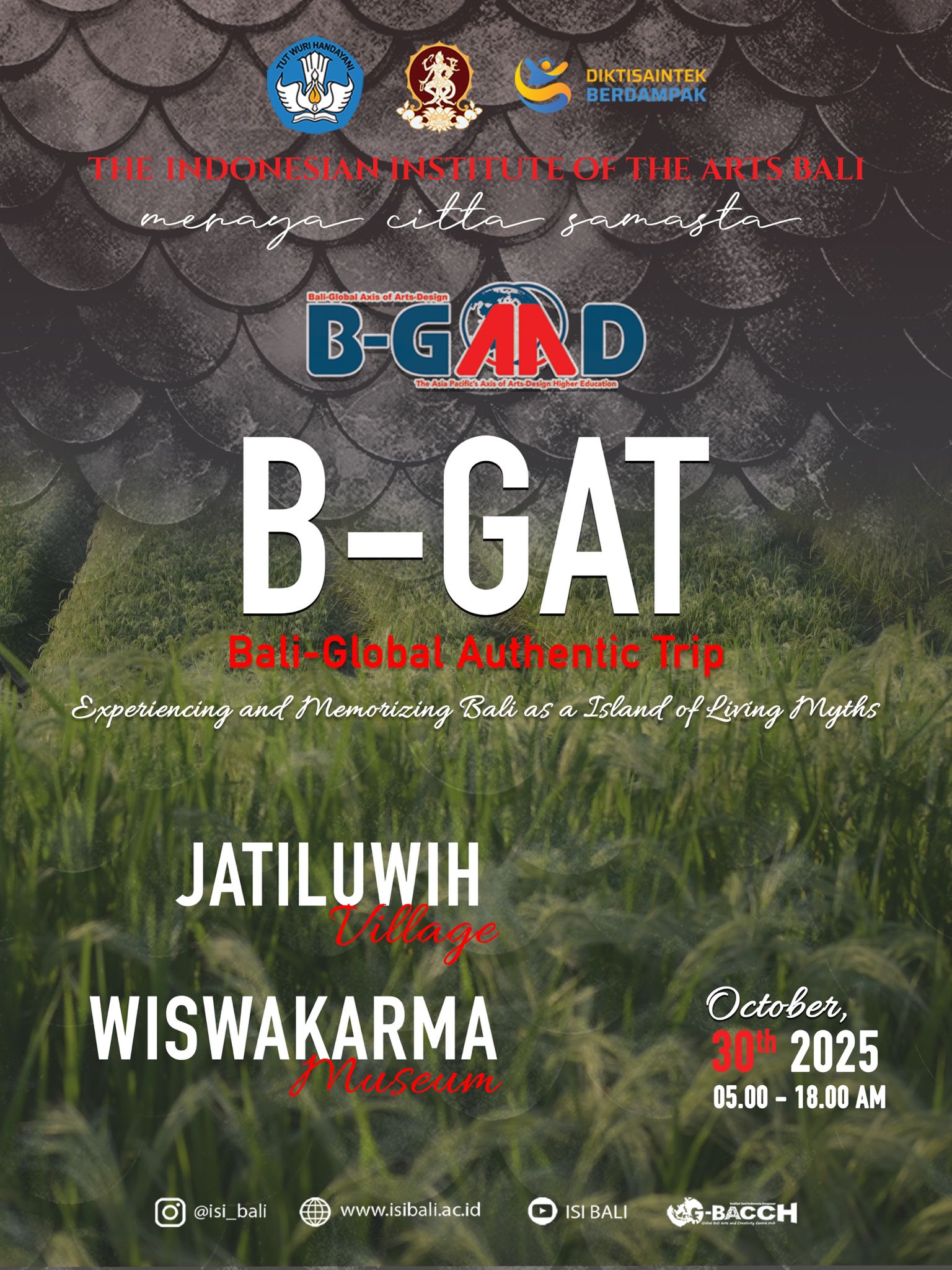As an actualization of the B-GAAD vision and mission, eight main programs have been established, namely: (1) Bali-Global Arts and Design Symposium (B-GADS); (2) Bali-Global Performing Arts Map (B-GPAM); (3) Bali-Global Art Map Exhibition (B-GAME); (4) Bali- Global Innovative Design Map Exhibition (B-GIDME); (5) Bali-Global Encounter Figure (B-GEF); (6) Bali-Global Expo and Job Fair (B-GEJF); (7) B-GAAD Leaders’ Summit; dan (8) Bali-Global Authentic Trip (B-GAT).