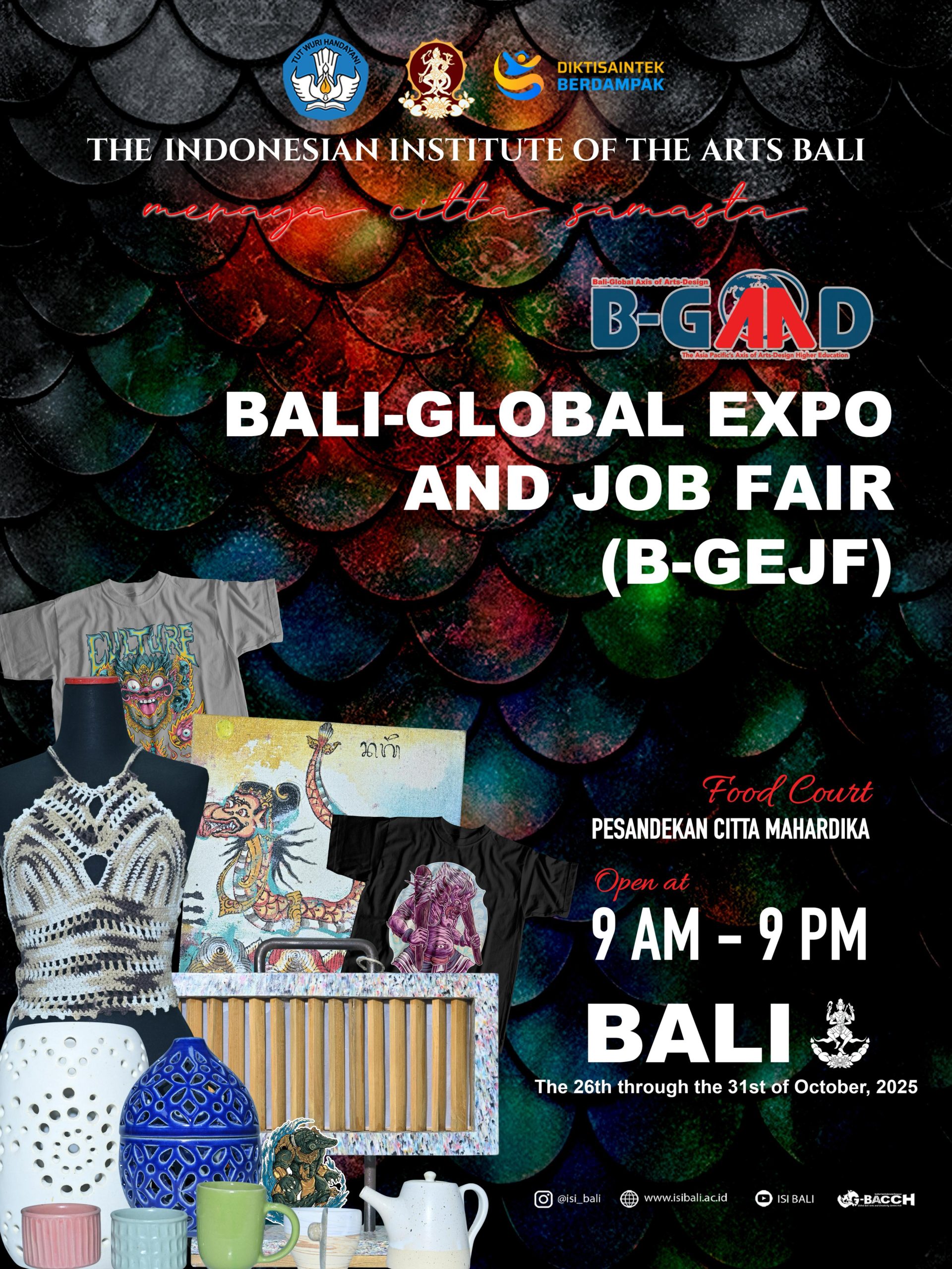 Bali-Global Expo and Job Fair (B-GEJF) is an exhibition event held in collaboration with several strategic partners, aiming to expand networks among students, alumni, and professionals in the fields of art and design. It took place as part of the Bali-Global Axis of Arts and Design (B-GAAD) series over three days, from October 21 to 23, 2024. Students, lecturers, alumni, education staff, B-GAAD delegates from both domestic and international institutions, and the general public enthusiastically visited each booth, enjoying the products while engaging in dialogue with the tenants.