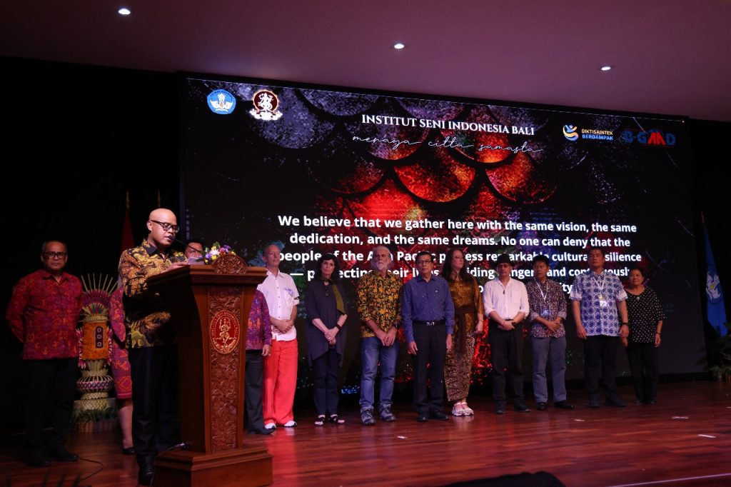 Photo: Reading of the B-GAAD Declaration by the Rector of ISI Bali, Prof. Dr. Wayan “Kun” Adnyana, witnessed by the leaders of art and design universities across the Asia–Pacific region, Tuesday (October 28) at the Kirtya Sabha Mahottama Auditorium, ISI Bali.