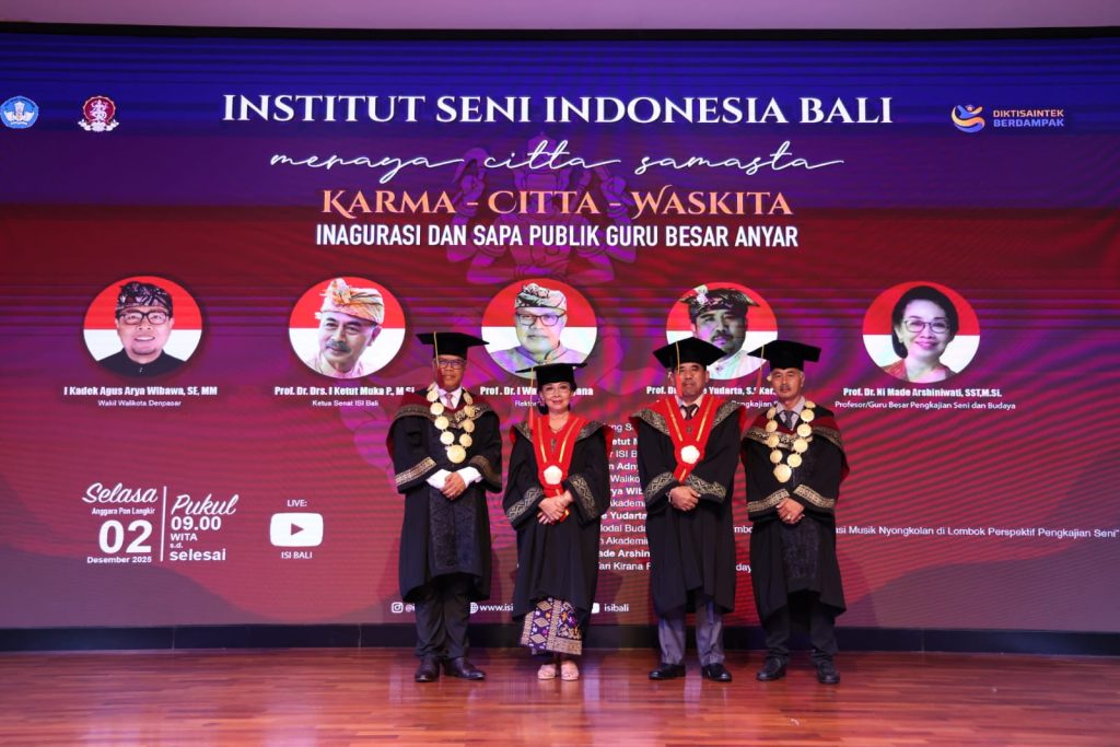 Institut Seni Indonesia Bali (ISI BALI) ngukuhang kalih Guru Besar anyar malarapan antuk Inagurasi lan Sapa Publik Guru Besar Anyar “Karma-Citta-Waskita”, Anggara Pon Langkir pinanggal 2 Desember 2025 ring Auditorium Kirtya Sabha Mahottama, ISI BALI. Maka kalih professor anyar sane kakukuhang inggih punika Prof. Dr. I Gede Yudarta lan Prof. Dr. Ni Made Arshiniwati.