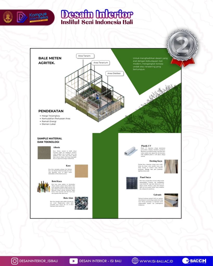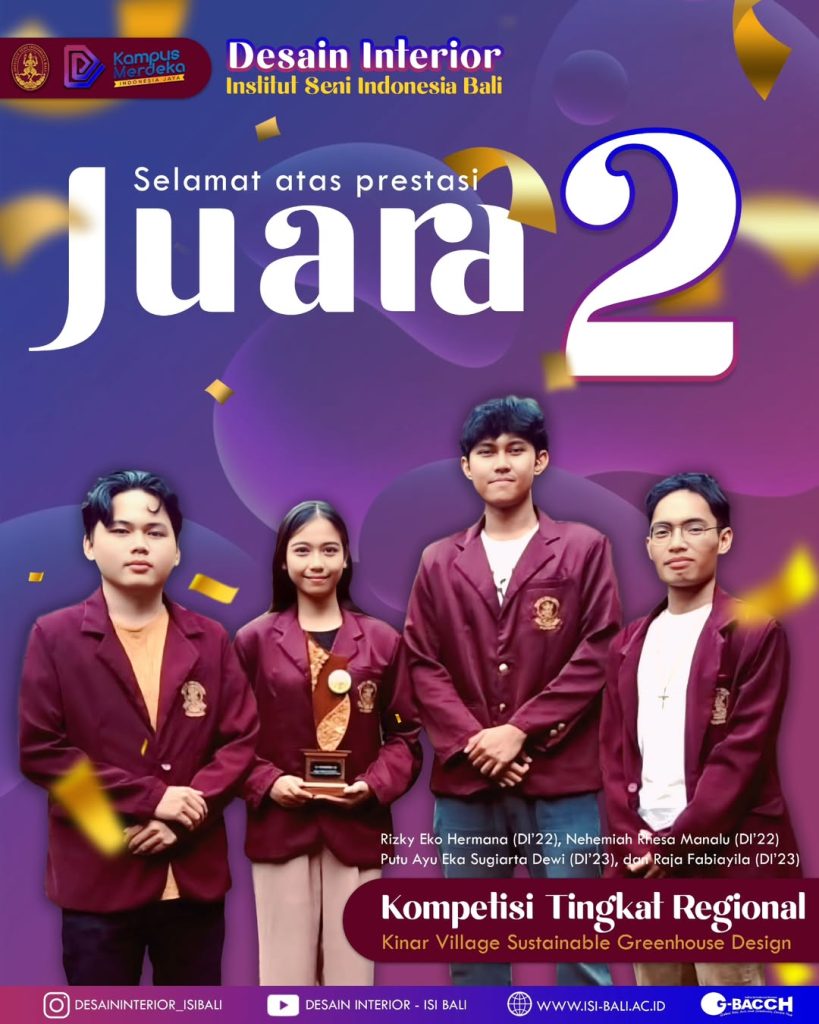 Empat mahasiswa Program Studi Desain Interior ISI Bali kembali mengukir prestasi gemilang dalam kompetisi regional se-Bali yang diadakan oleh Kinar Village. Rizky Eko Hermana, Nehemiah Rhesa Manalu, Putu Ayu Eka Sugiarta Dewi, dan Raja Fabiayiala berhasil meraih Juara 2 (1st Runner Up) dengan karya mereka yang bertemakan Sustainable Greenhouse Design.